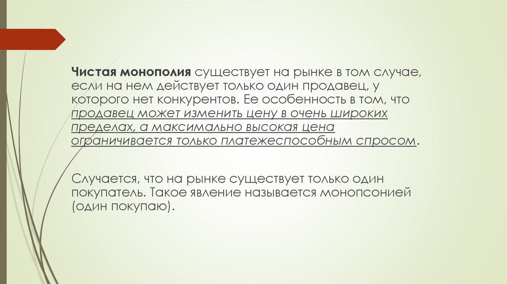 Чистая монополия существует на рынке в том случае,если на нем действует только один продавец, у