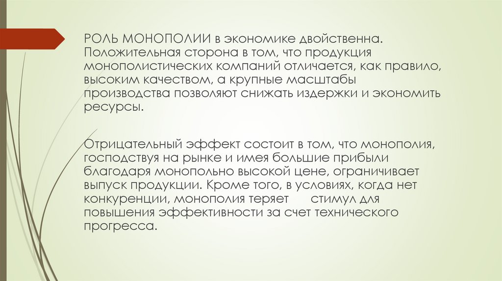 РОЛЬ МОНОПОЛИИ в экономике двойственна.Положительная сторона в том, что продукция