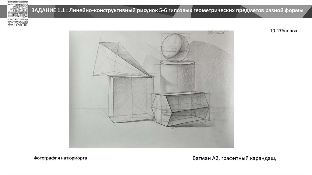 ЗАДАНИЕ 1.1 : Линейно-конструктивный рисунок 5-6 гипсовых геометрических предметов разной формы10-17баллов