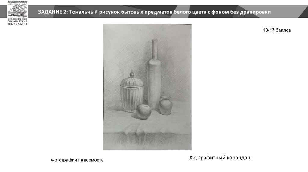 ЗАДАНИЕ 2: Тональный рисунок бытовых предметов белого цвета с фоном без драпировки10-17 баллов