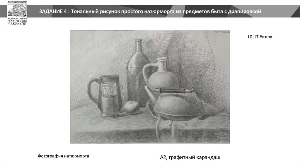 ЗАДАНИЕ 4 : Тональный рисунок простого натюрморта из предметов быта с драпировкой10-17 балла