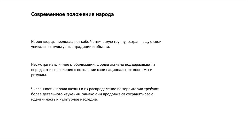 Современное положение народаНарод шорцы представляет собой этническую группу, сохраняющую свои