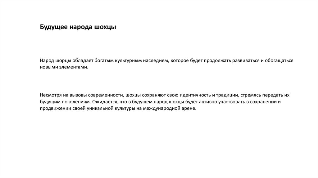 Будущее народа шохцыНарод шорцы обладает богатым культурным наследием, которое будет продолжать развиваться и обогащаться