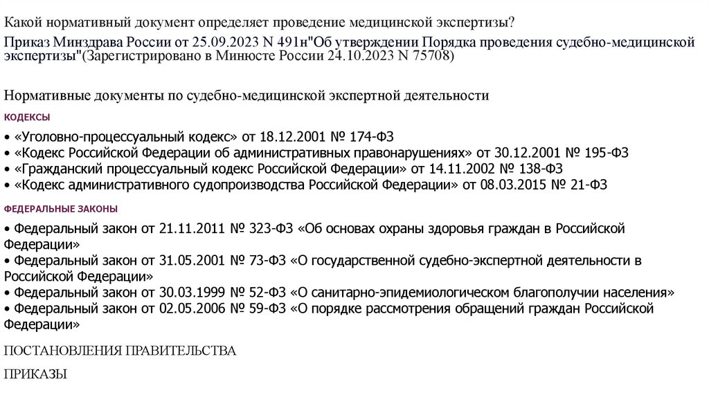 Какой нормативный документ определяет проведение медицинской экспертизы?Приказ Минздрава России от 25.09.2023 N 491н"Об утверждении Порядка проведения судебно-медицинской