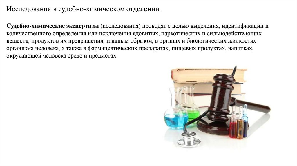 Исследования в судебно-химическом отделении.Судебно-химические экспертизы (исследования) проводят с целью выделения, идентификации и