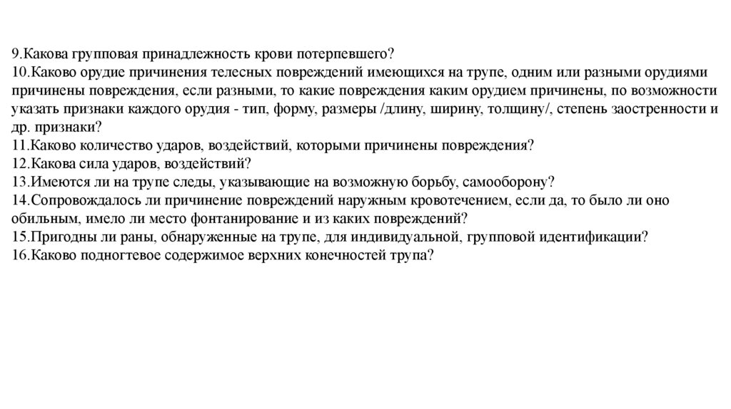 9.Какова групповая принадлежность крови потерпевшего?10.Каково орудие причинения телесных повреждений имеющихся на трупе, одним или разными орудиями