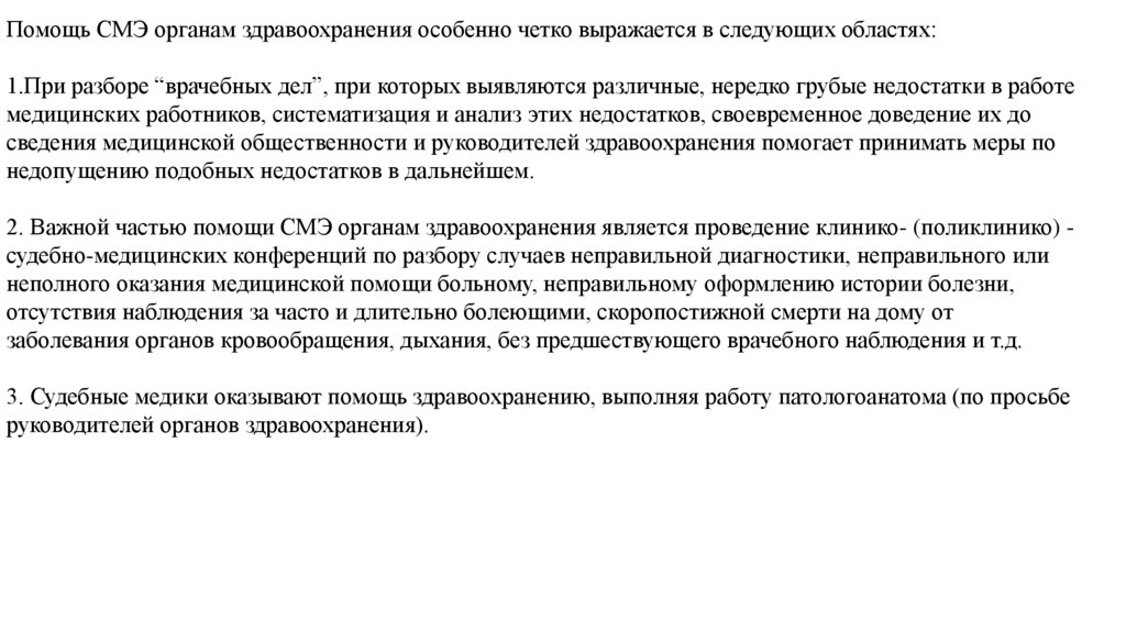 Помощь СМЭ органам здравоохранения особенно четко выражается в следующих областях:1.При разборе “врачебных дел”, при которых выявляются различные, нередко грубые недостатки в работе