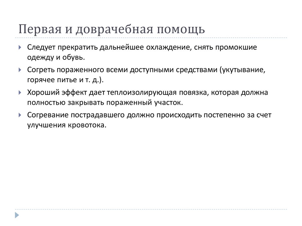 Первая и доврачебная помощьСледует прекратить дальнейшее охлаждение, снять промокшие