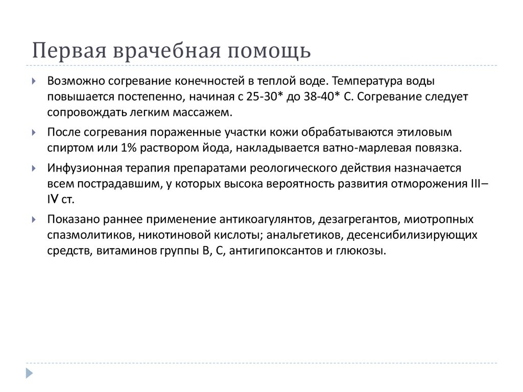 Первая врачебная помощьВозможно согревание конечностей в теплой воде. Температура воды