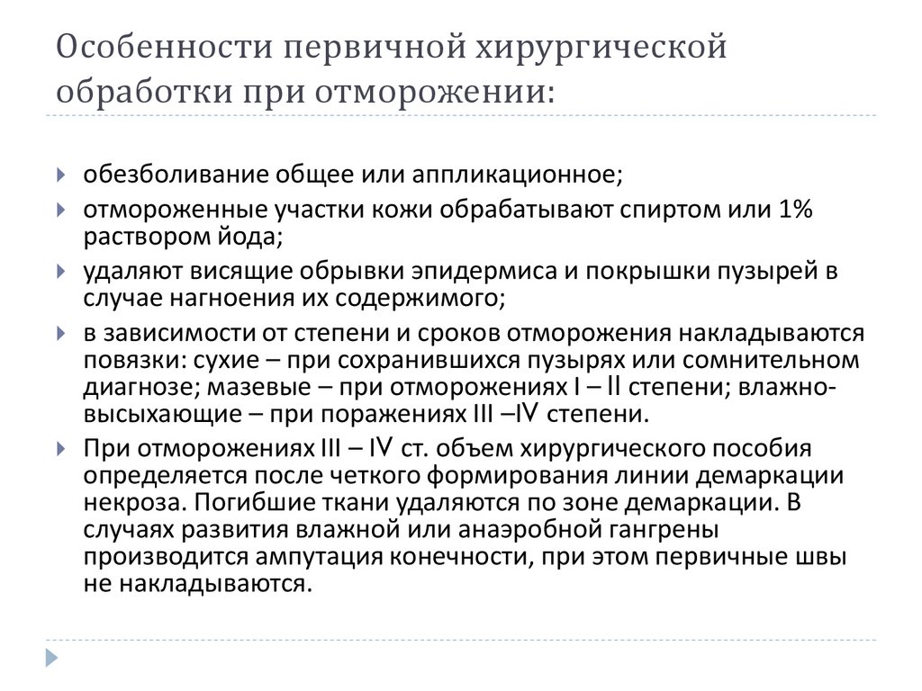Особенности первичной хирургическойобработки при отморожении: