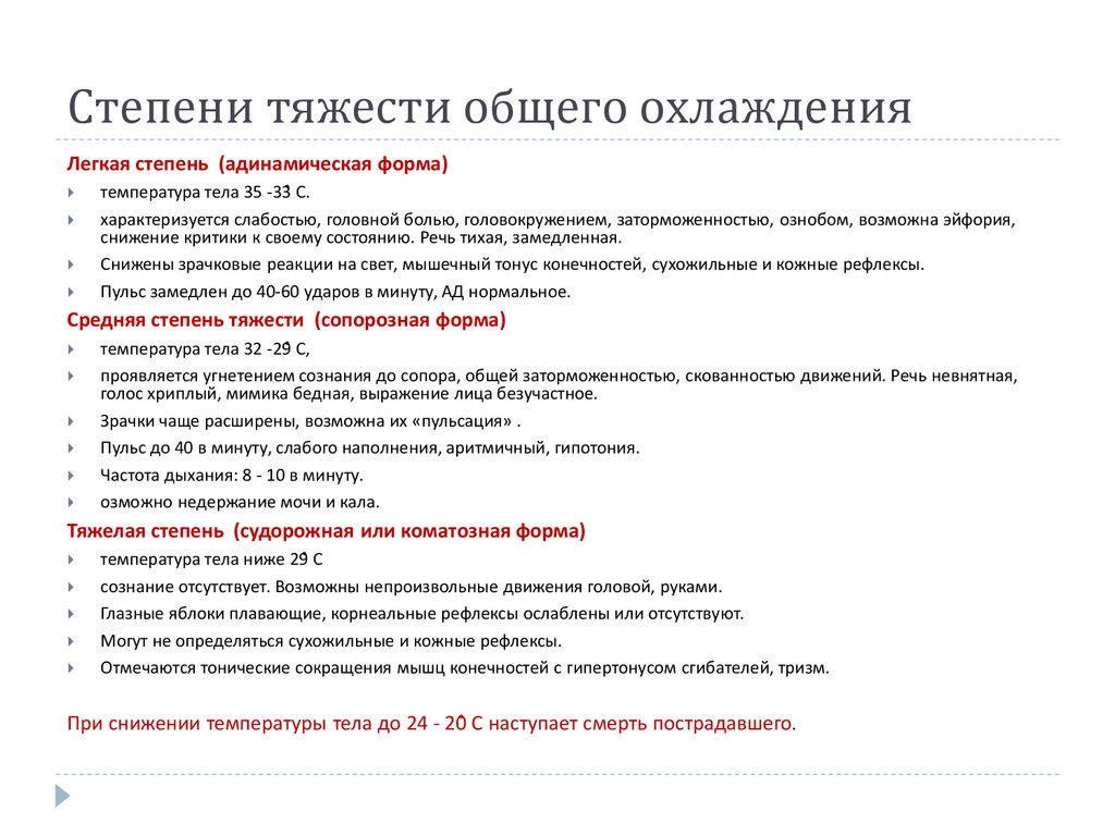 Степени тяжести общего охлажденияЛегкая степень (адинамическая форма)