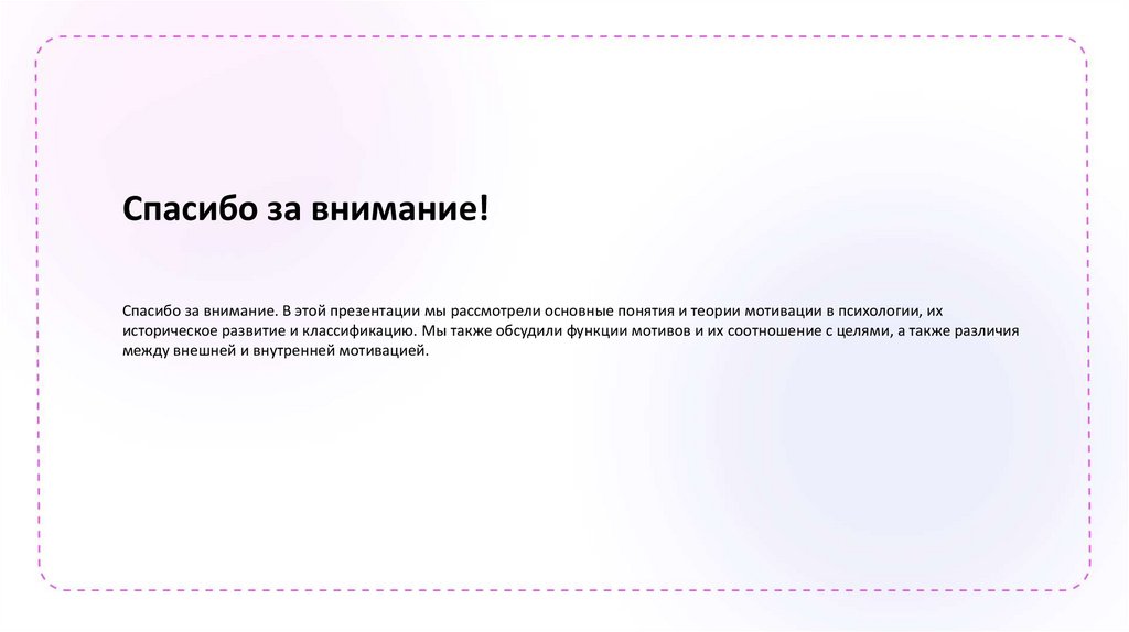 Спасибо за внимание!Спасибо за внимание. В этой презентации мы рассмотрели основные понятия и теории мотивации в психологии, их