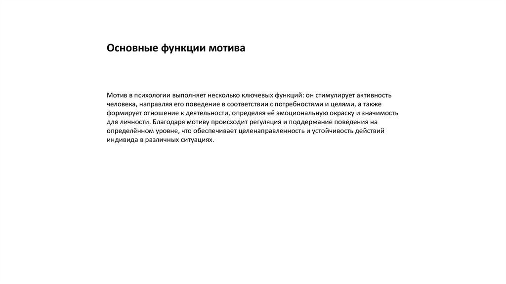 Основные функции мотиваМотив в психологии выполняет несколько ключевых функций: он стимулирует активность