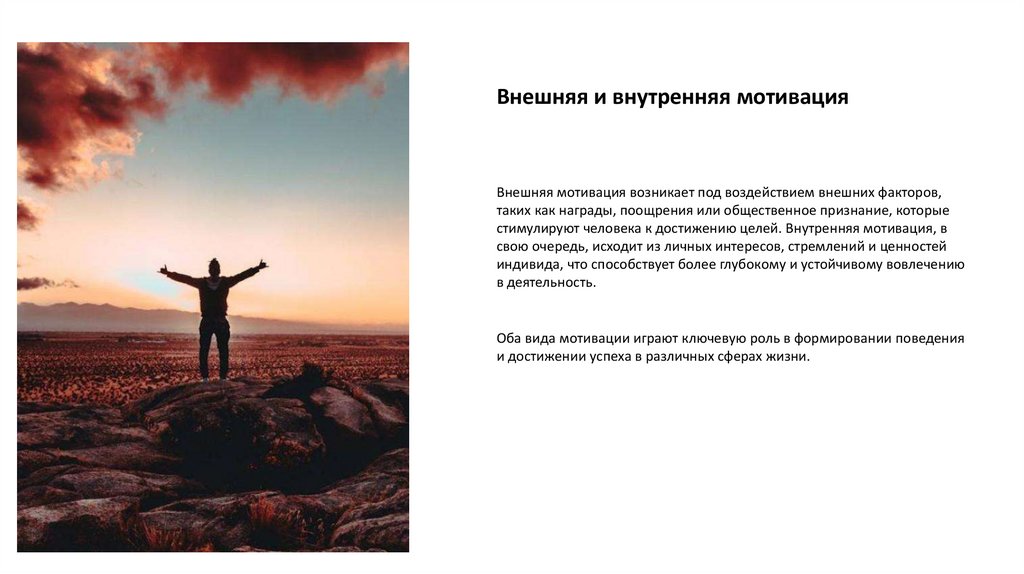 Внешняя и внутренняя мотивацияВнешняя мотивация возникает под воздействием внешних факторов,