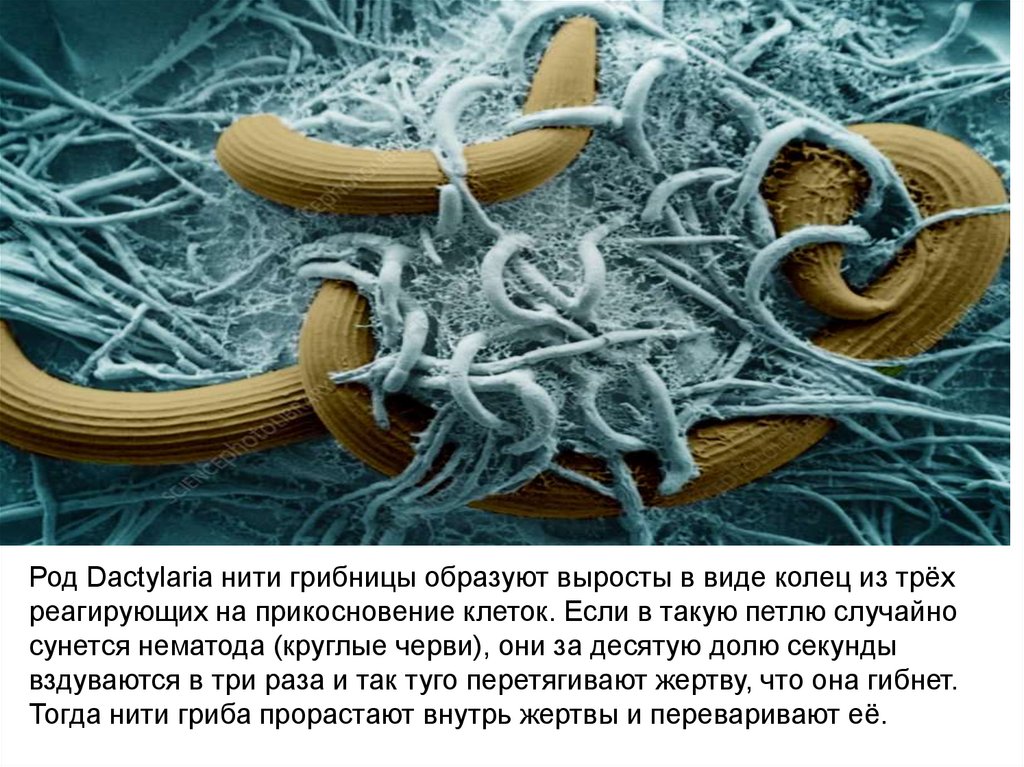 Род Dactylaria нити грибницы образуют выросты в виде колец из трёхреагирующих на прикосновение клеток. Если в такую петлю случайно