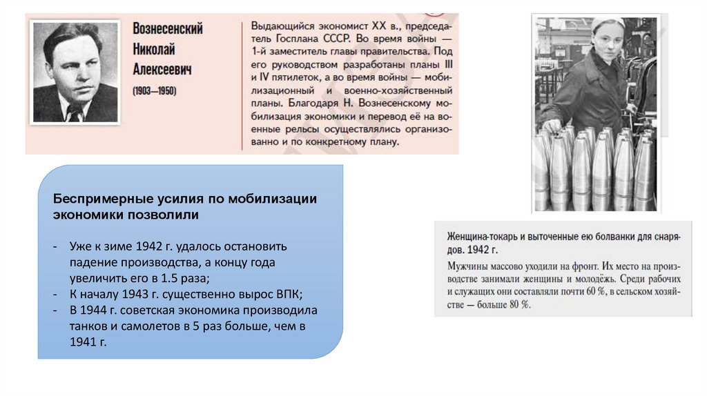 работы эвакуированных заводов, увеличение добычи на шахтах и нефтепромыслах,