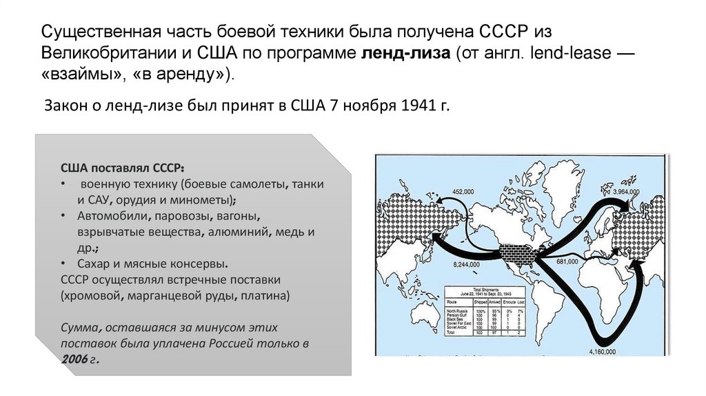 Существенная часть боевой техники была получена СССР изВеликобритании и США по программе ленд-лиза (от англ. lend-lease —