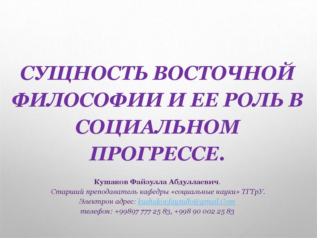 1. Сущность восточной философии и ее роль в социальном прогрессе. Кушаков Файзулла Абдуллаевич. Старший преподаватель кафедры
