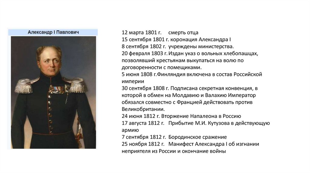 12 марта 1801 г. смерть отца15 сентября 1801 г. коронация Александра I