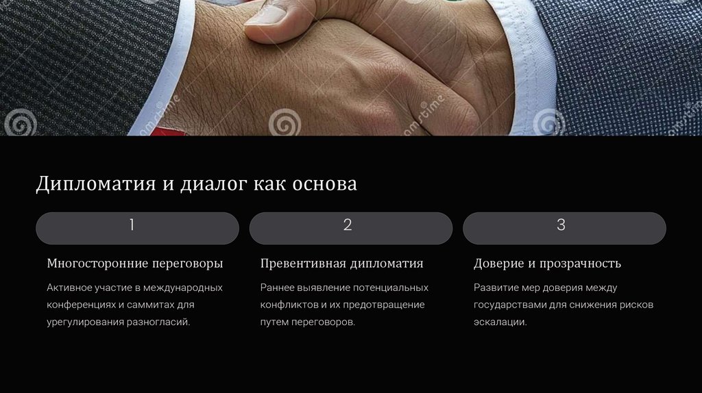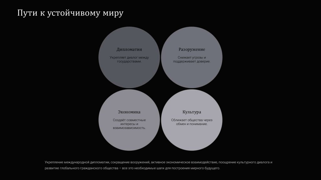 Укрепление международной дипломатии, сокращение вооружений, активное экономическое взаимодействие, поощрение культурного диалога и
