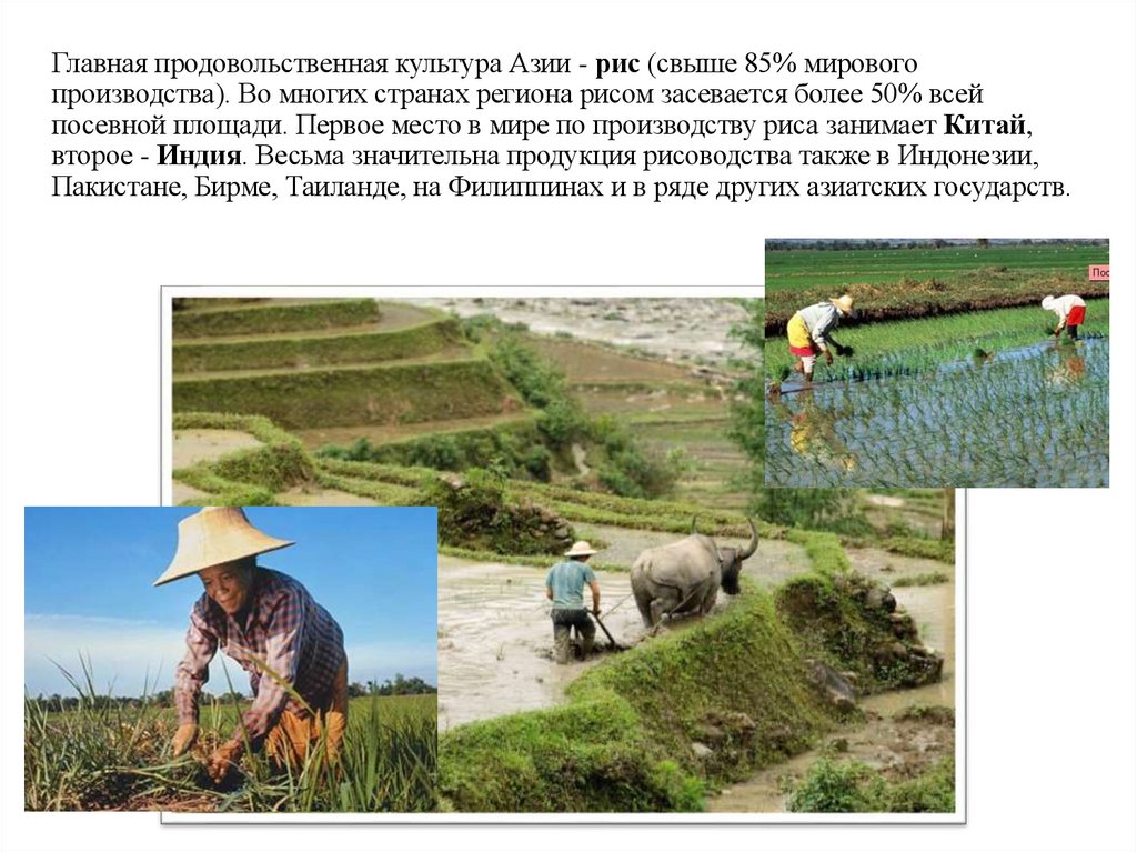 Главная продовольственная культура Азии - рис (свыше 85% мировогопроизводства). Во многих странах региона рисом засевается более 50% всей