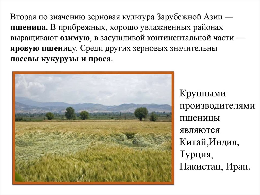 Вторая по значению зерновая культура Зарубежной Азии —пшеница. В прибрежных, хорошо увлажненных районах