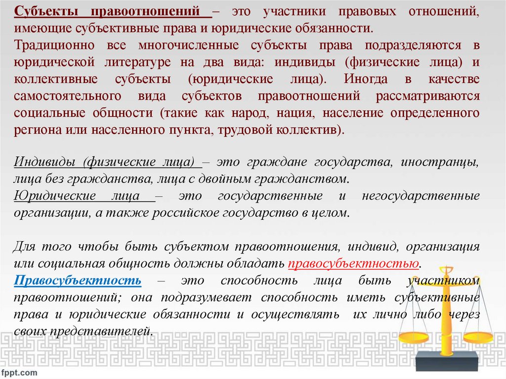• Субъекты правоотношения – лица, участвующие в правоотношении,