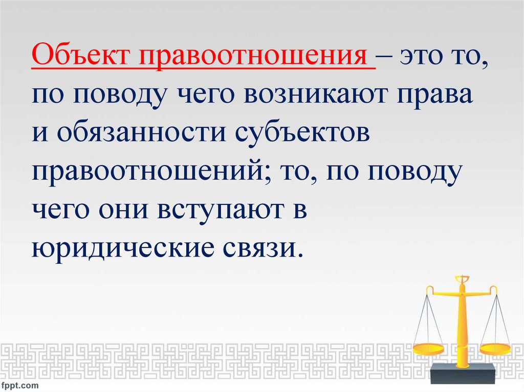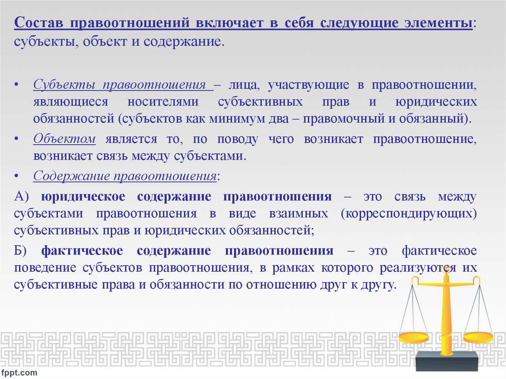 Состав правоотношений включает в себя следующие элементы:субъекты, объект и содержание.