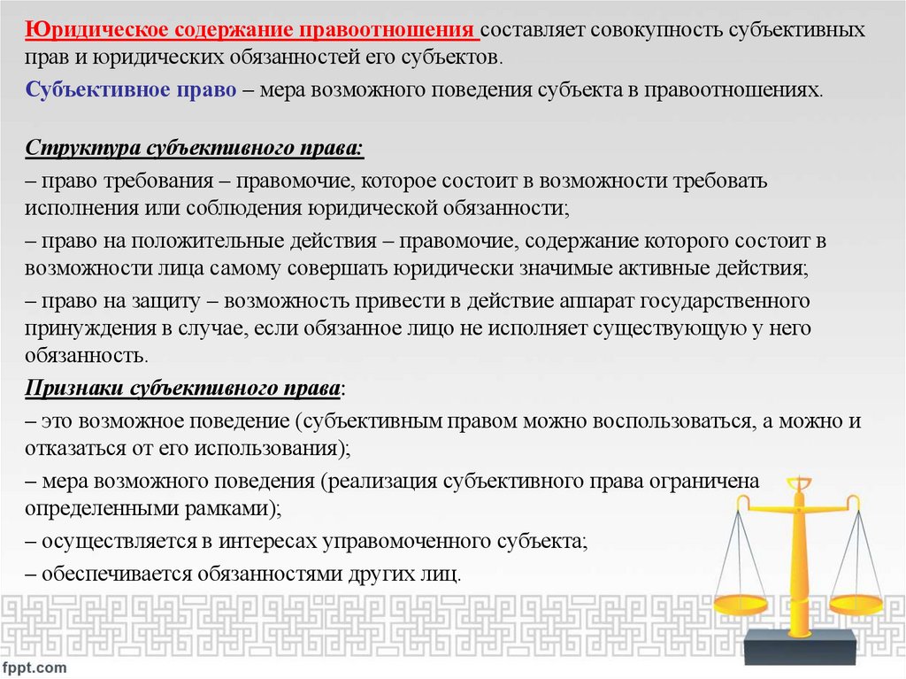 Юридическое содержание правоотношения составляет совокупность субъективныхправ и юридических обязанностей его субъектов.