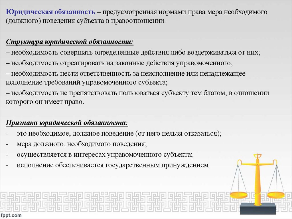 Юридическая обязанность – предусмотренная нормами права мера необходимого(должного) поведения субъекта в правоотношении.