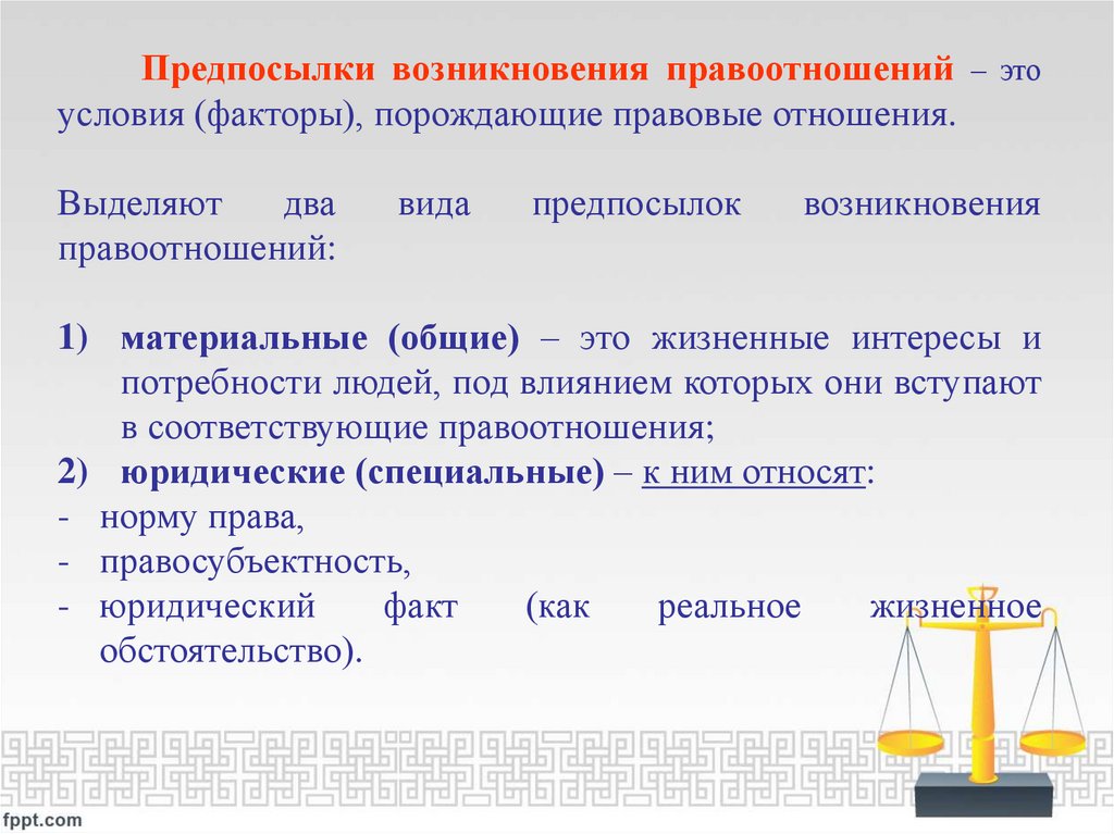 Предпосылки возникновения правоотношений – этоусловия (факторы), порождающие правовые отношения.
