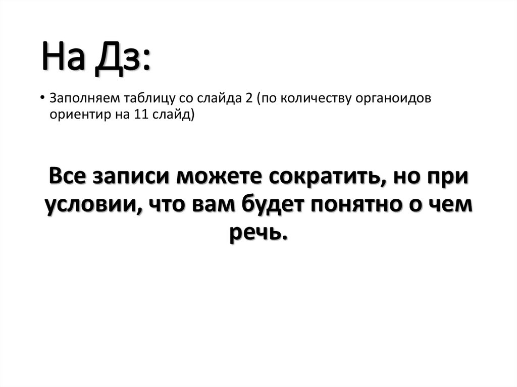 • Заполняем таблицу со слайда 2 (по количеству органоидовориентир на 11 слайд)