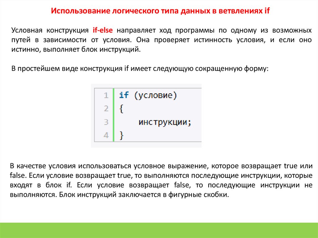 Использование логического типа данных в ветвлениях ifУсловная конструкция if-else направляет ход программы по одному из возможных