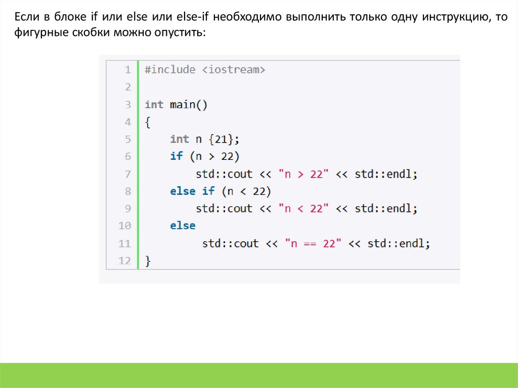 Если в блоке if или else или else-if необходимо выполнить только одну инструкцию, тофигурные скобки можно опустить: