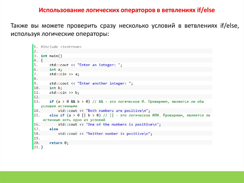 Использование логических операторов в ветвлениях if/elseТакже вы можете проверить сразу несколько условий в ветвлениях if/else,
