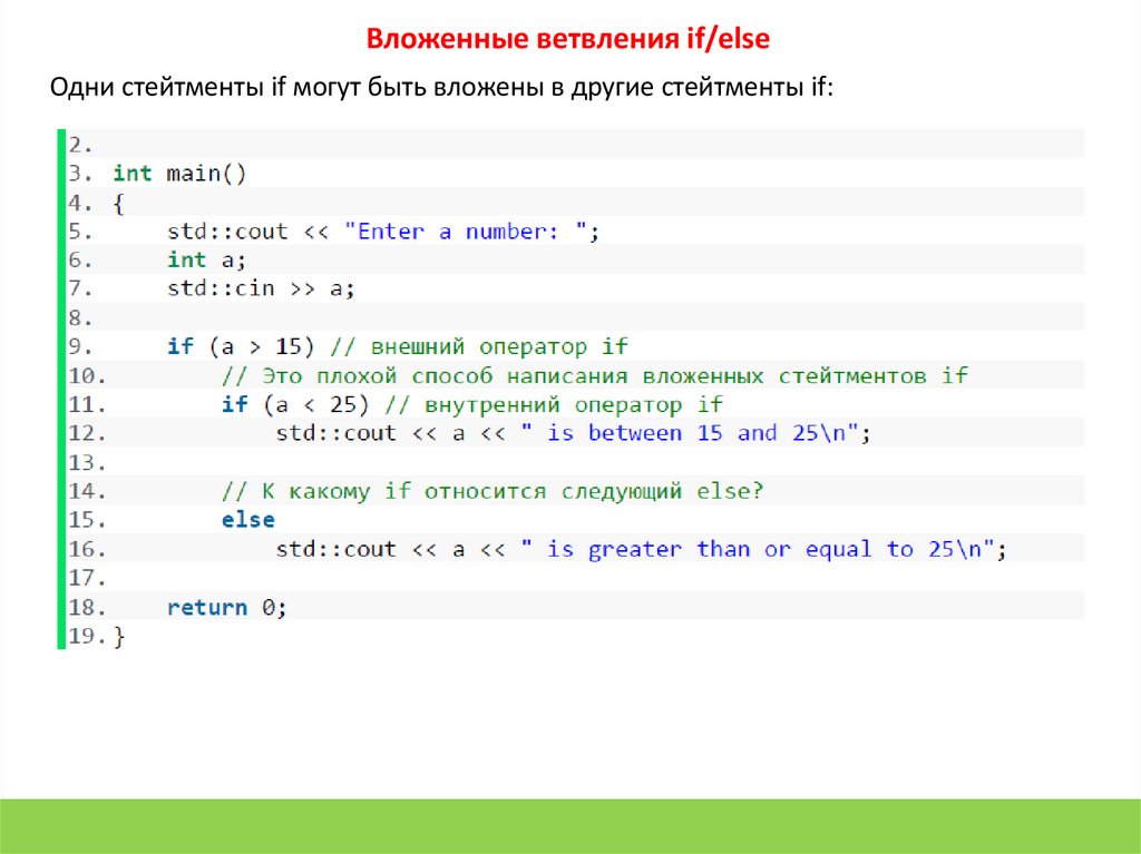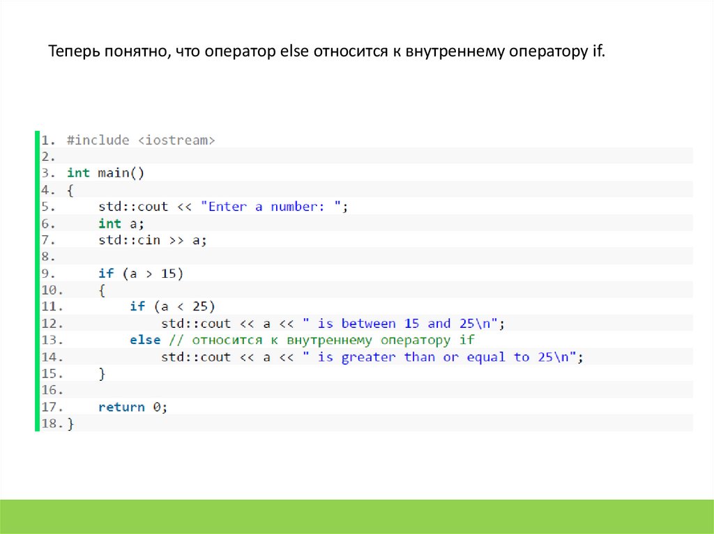 Теперь понятно, что оператор else относится к внутреннему оператору if.20.
