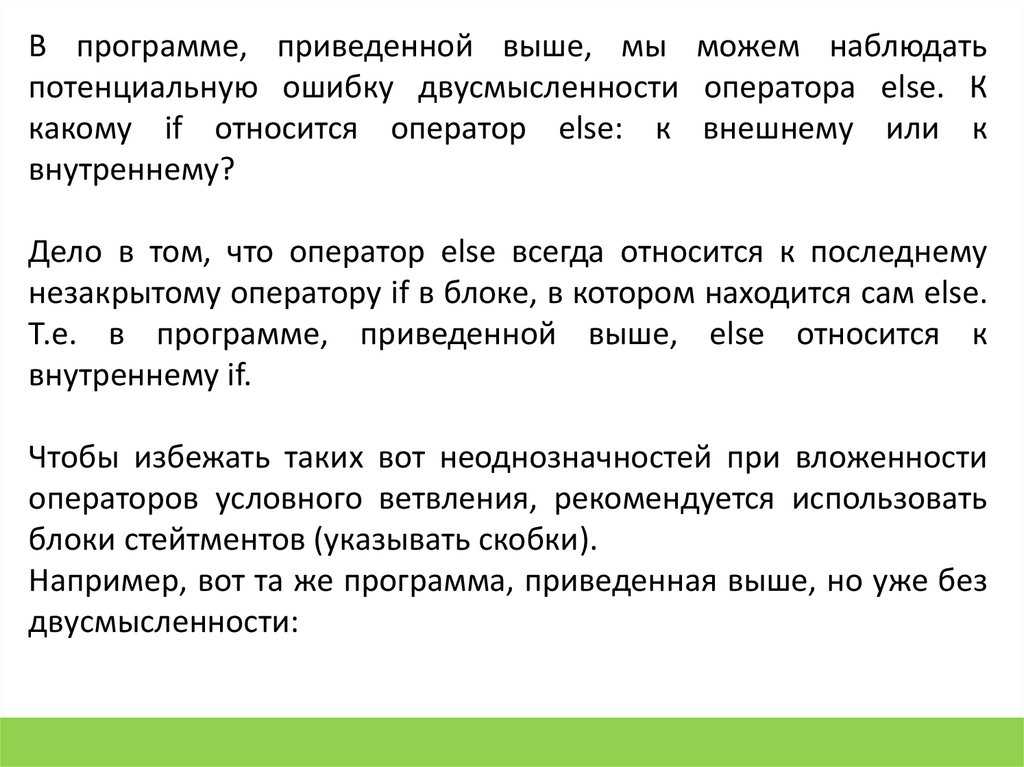 В программе, приведенной выше, мы можем наблюдатьпотенциальную ошибку двусмысленности оператора else. К