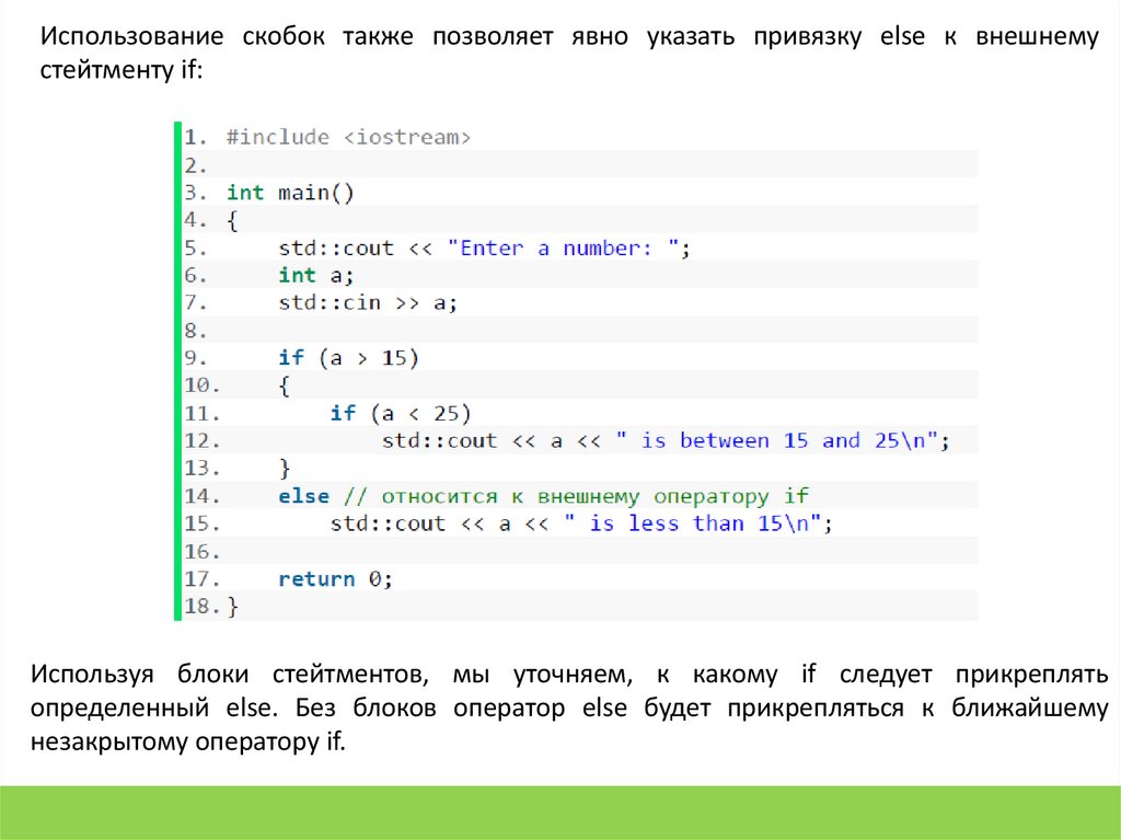 Использование скобок также позволяет явно указать привязку else к внешнемустейтменту if: