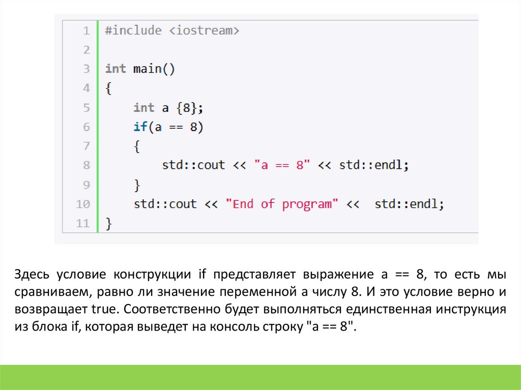 Здесь условие конструкции if представляет выражение a == 8, то есть мысравниваем, равно ли значение переменной a числу 8. И это условие верно и