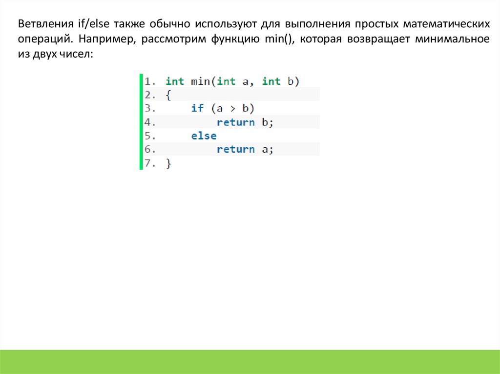Ветвления if/else также обычно используют для выполнения простых математическихопераций. Например, рассмотрим функцию min(), которая возвращает минимальное