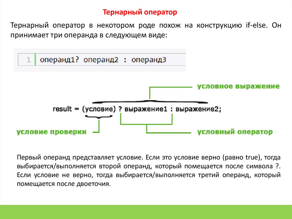 Тернарный операторТернарный оператор в некотором роде похож на конструкцию if-else. Он