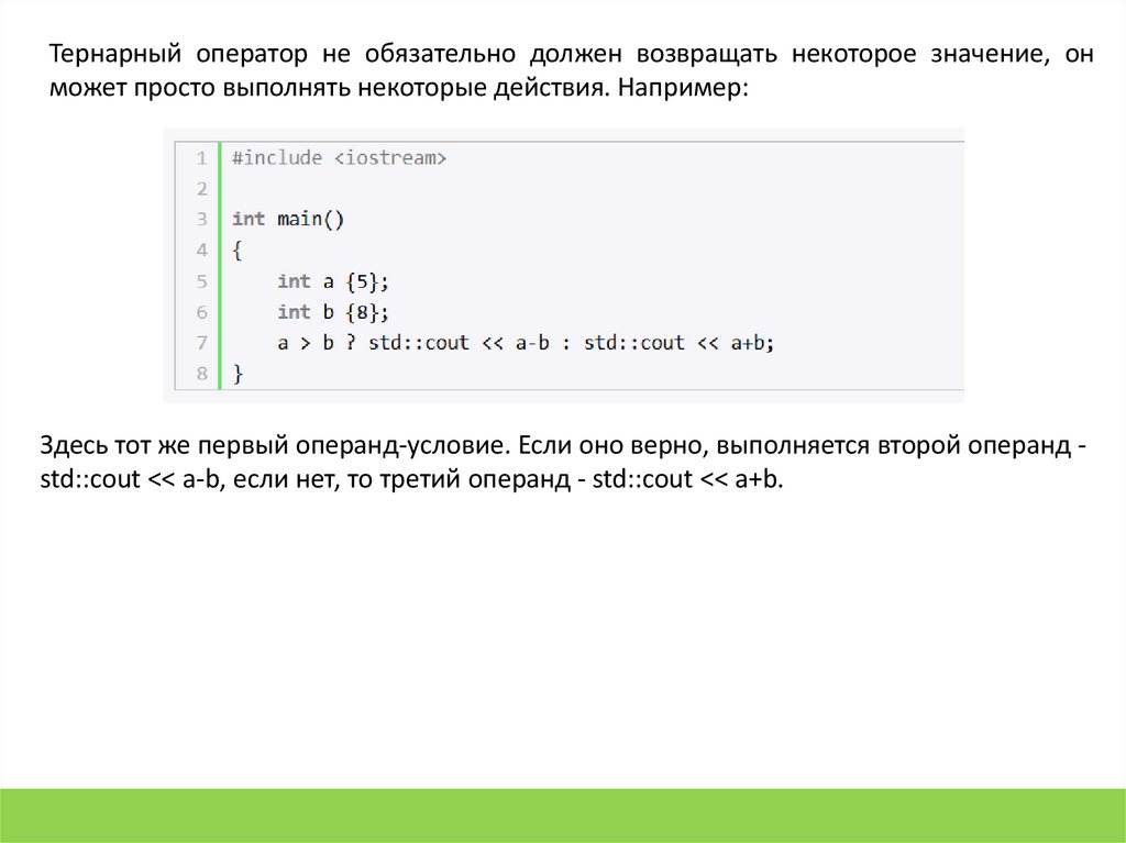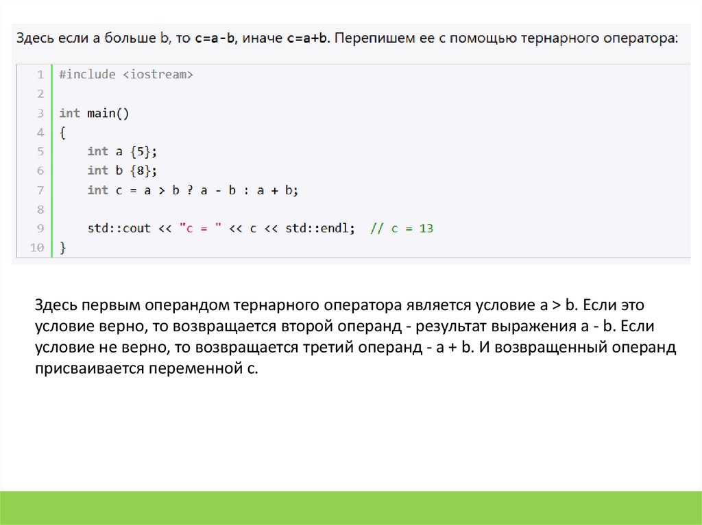 Здесь первым операндом тернарного оператора является условие a > b. Если этоусловие верно, то возвращается второй операнд - результат выражения a - b. Если