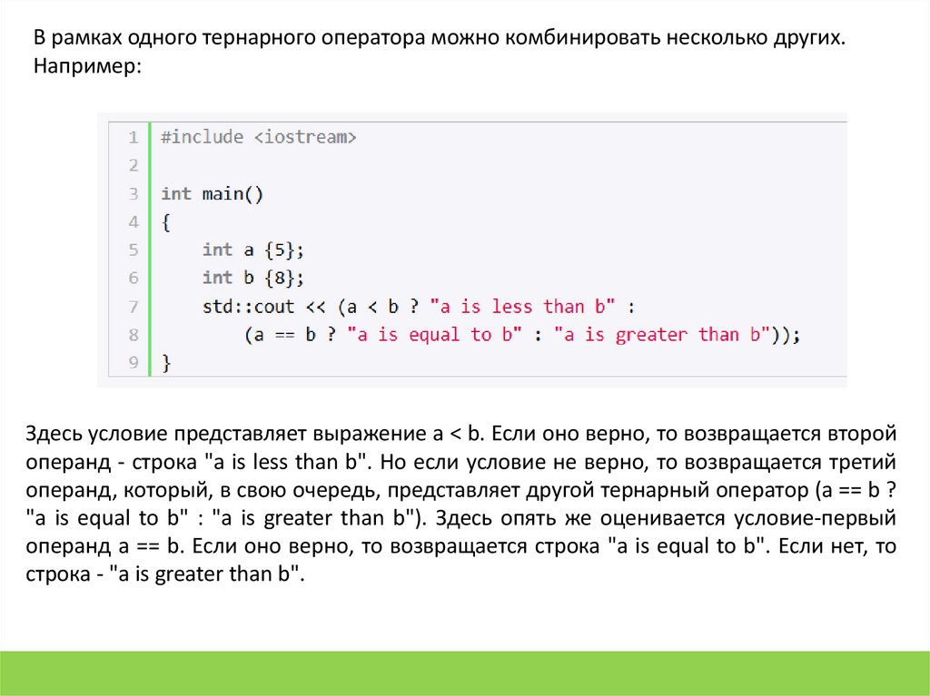 "a is equal to b" : "a is greater than b"). Здесь опять же оценивается условие-первый