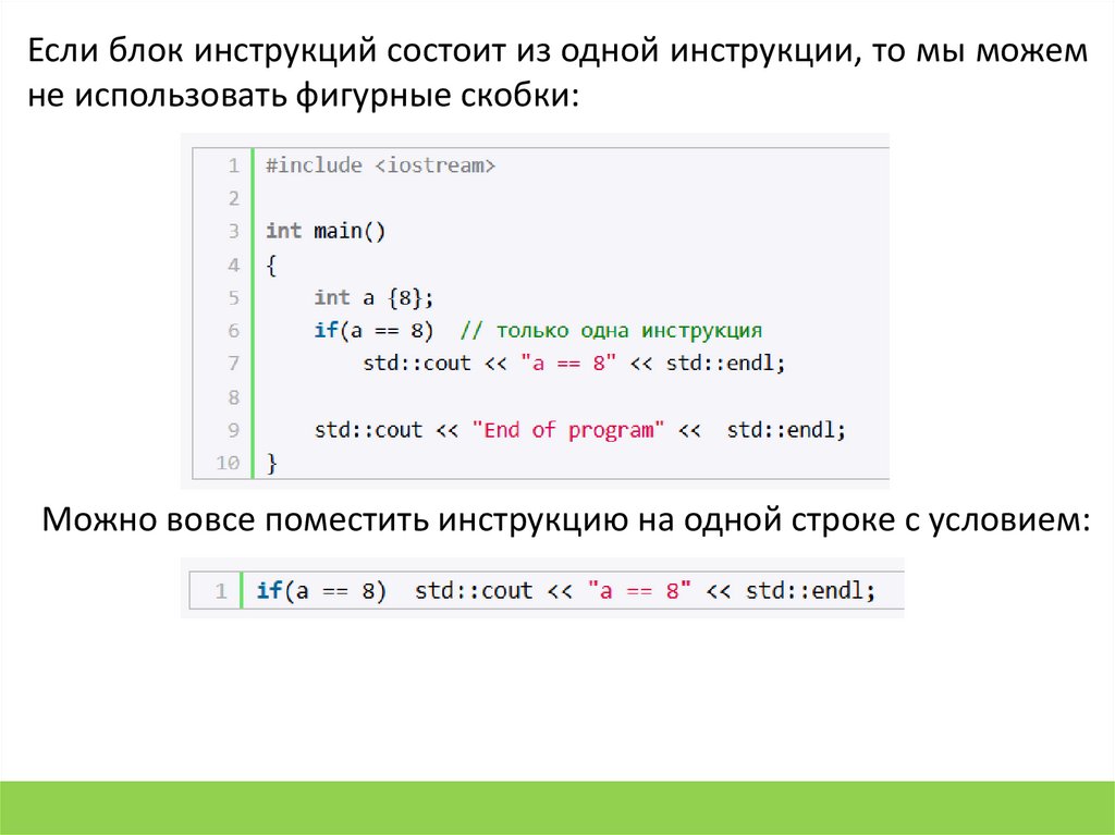 Если блок инструкций состоит из одной инструкции, то мы можемне использовать фигурные скобки: