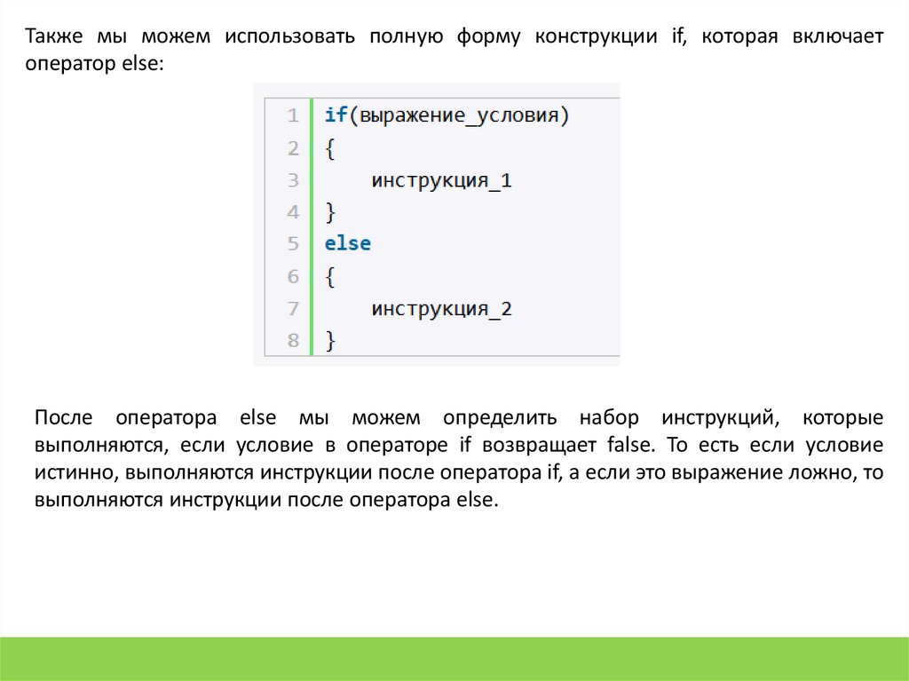Также мы можем использовать полную форму конструкции if, которая включаетоператор else: