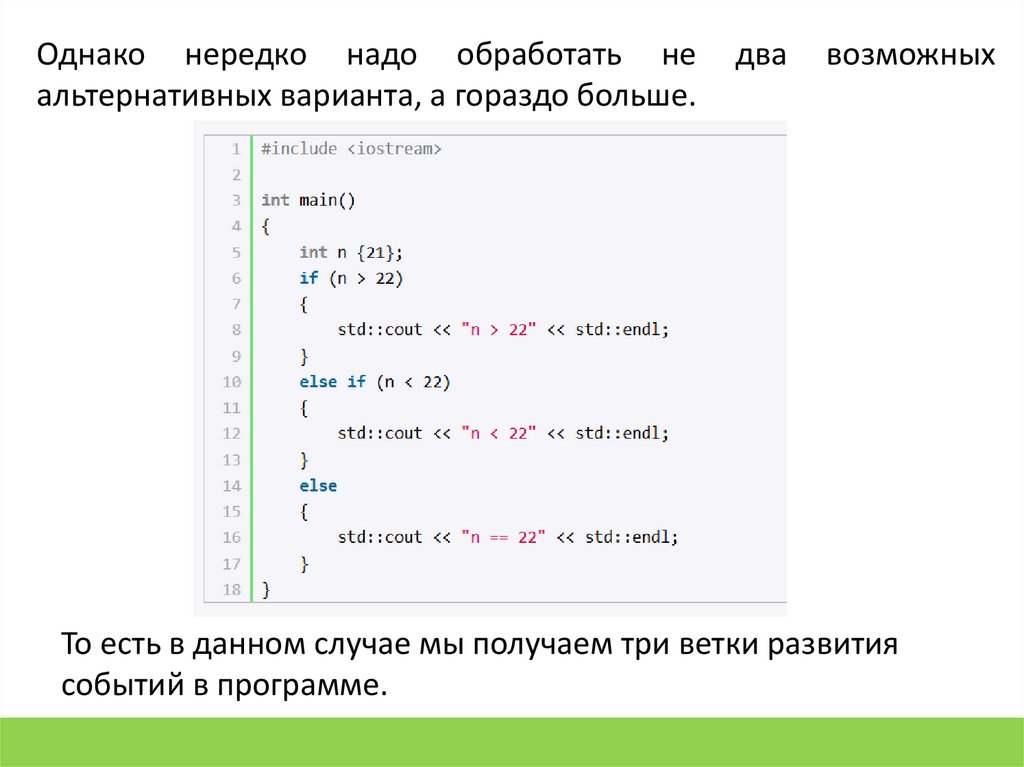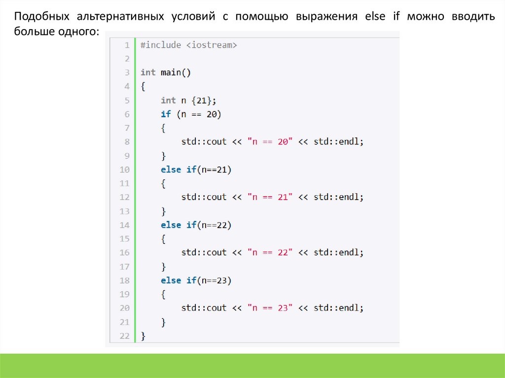 Подобных альтернативных условий с помощью выражения else if можно вводитьбольше одного: