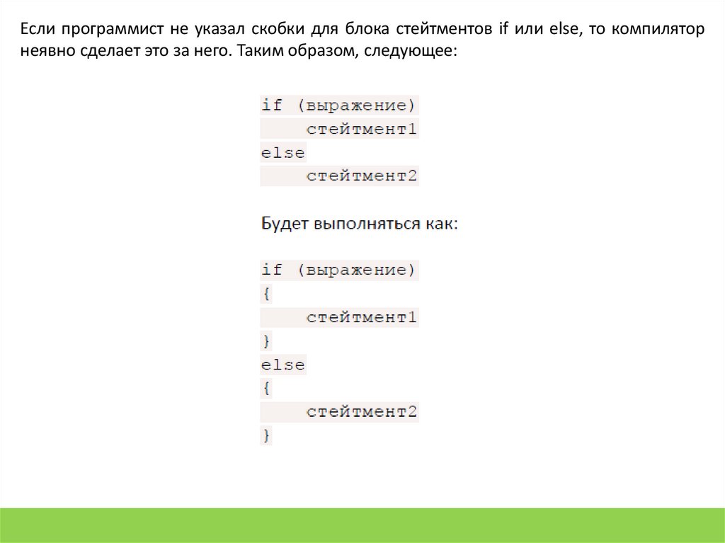 Если программист не указал скобки для блока стейтментов if или else, то компиляторнеявно сделает это за него. Таким образом, следующее: