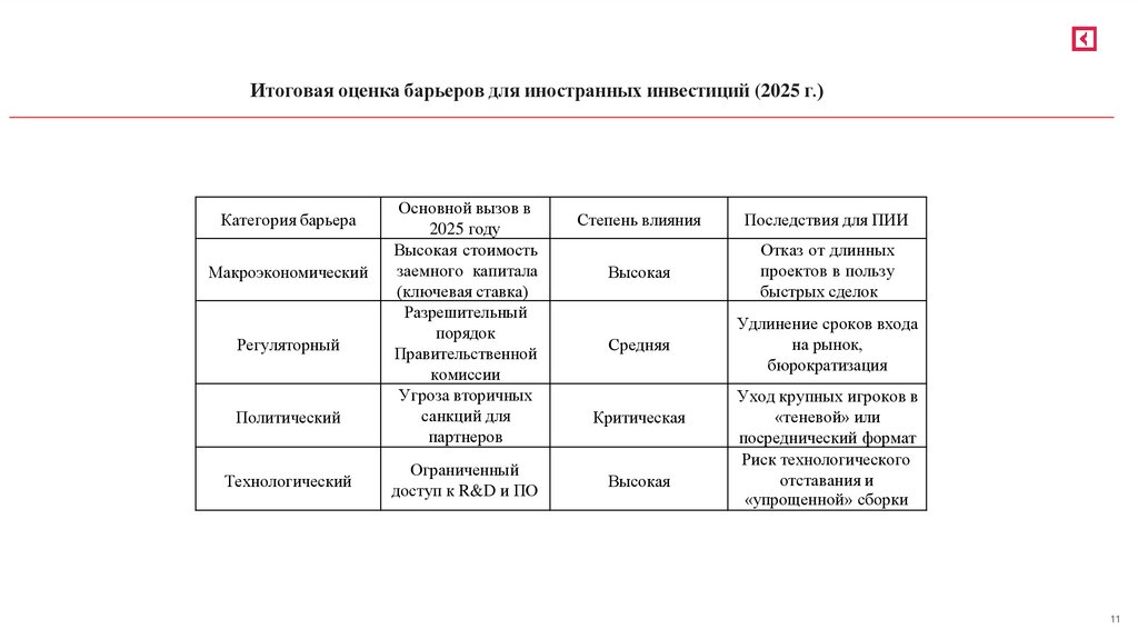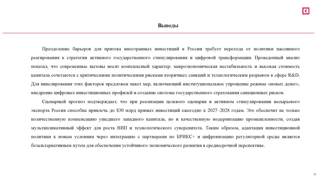 ВыводыПреодоление барьеров для притока иностранных инвестиций в России требует перехода от политики пассивного