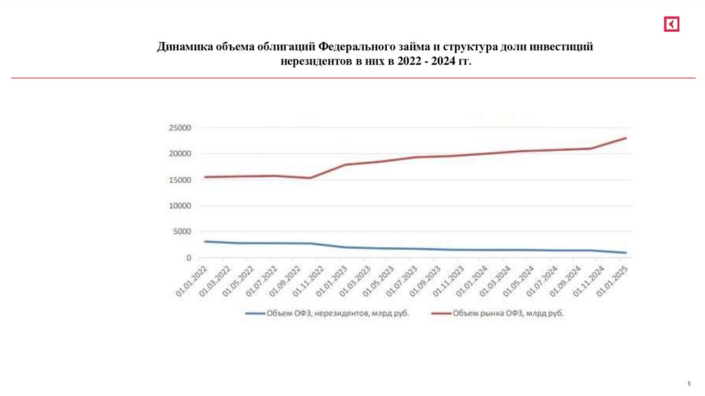 Динамика объема облигаций Федерального займа и структура доли инвестицийнерезидентов в них в 2022 - 2024 гг.