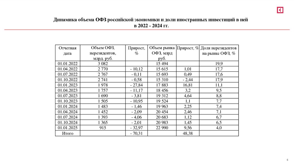 Динамика объема ОФЗ российской экономики и доли иностранных инвестиций в нейв 2022 - 2024 гг.